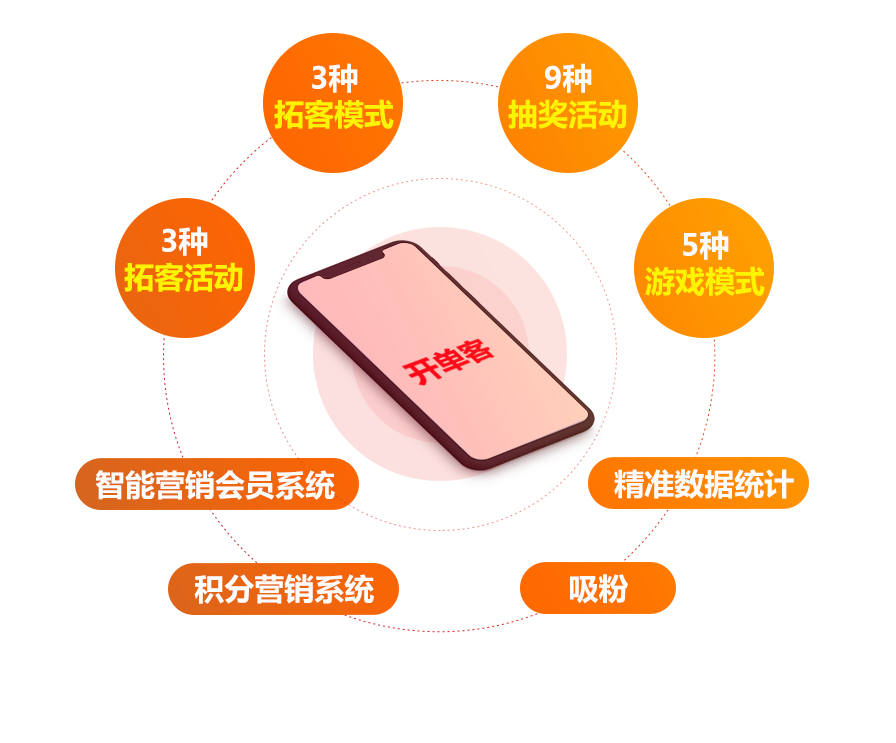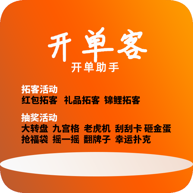 乖好开单客拓客系统 开单客拓客营销提供线上、线下各类宣传、活动、营销为一体的解决方案。十余种营销系统自由搭配,帮助企业快速进入深度微营销。囊括:红包墙、一物一码、大转盘、九宫格、锦鲤营 销、红包拓客、抽奖营销等
